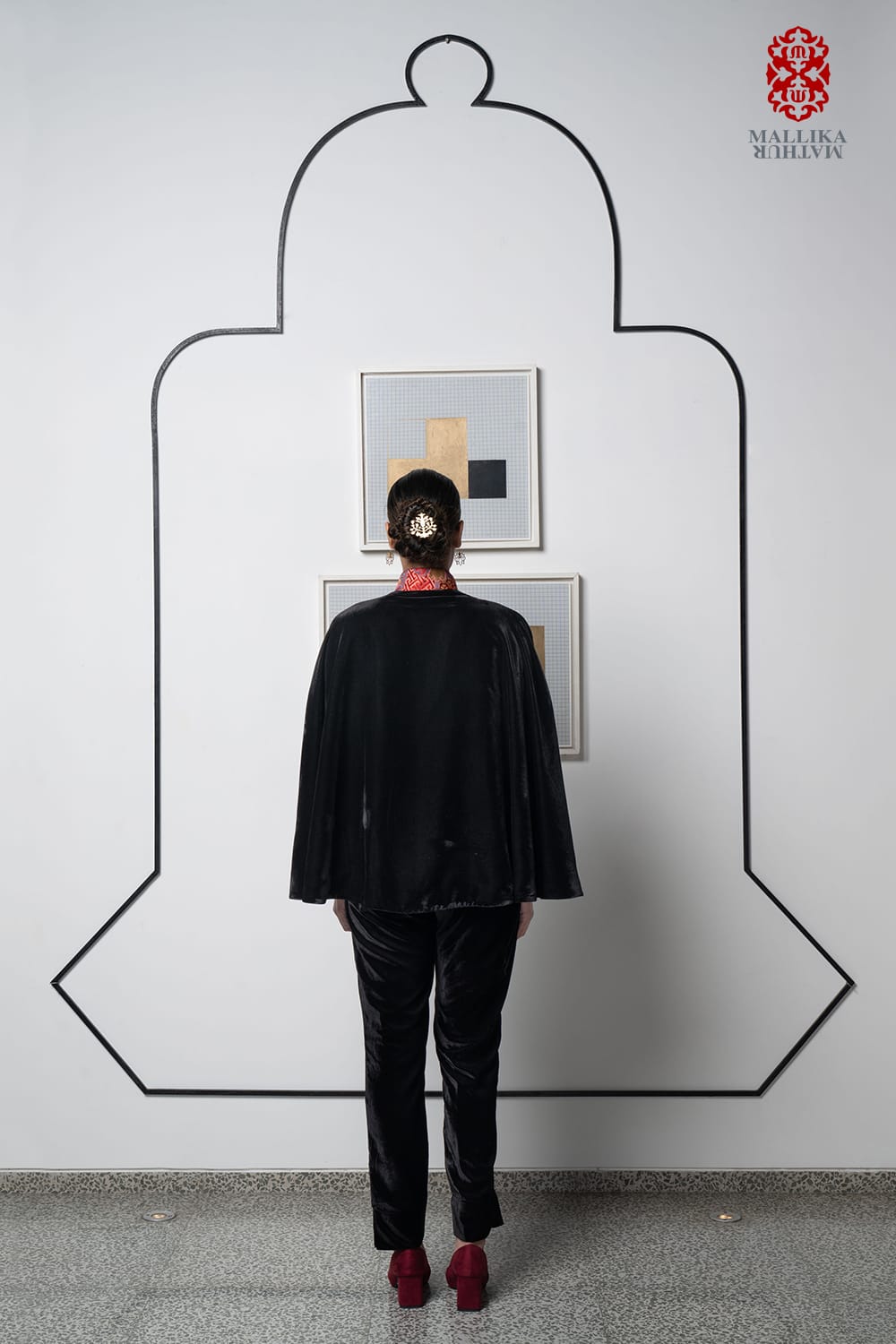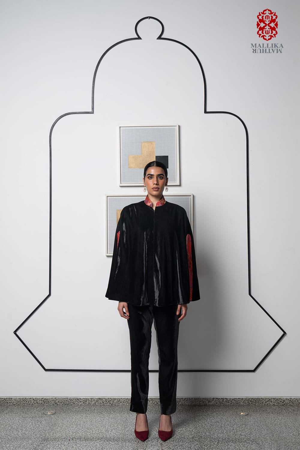 ‘Gyasar-Pema’ black silk velvet cape adorned with a geometric design Tibetan silk brocade in bright hues of red and blue. Traditionally used for Tibetan ritual garments it is used in various contemporary forms as shown here.