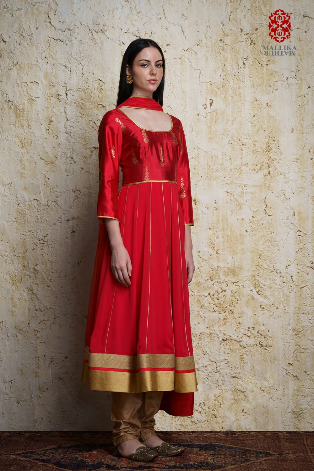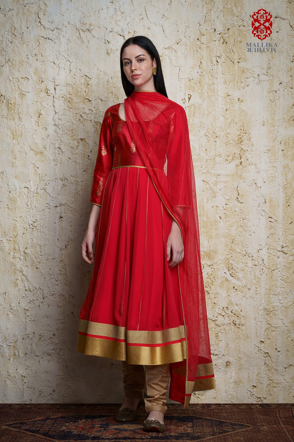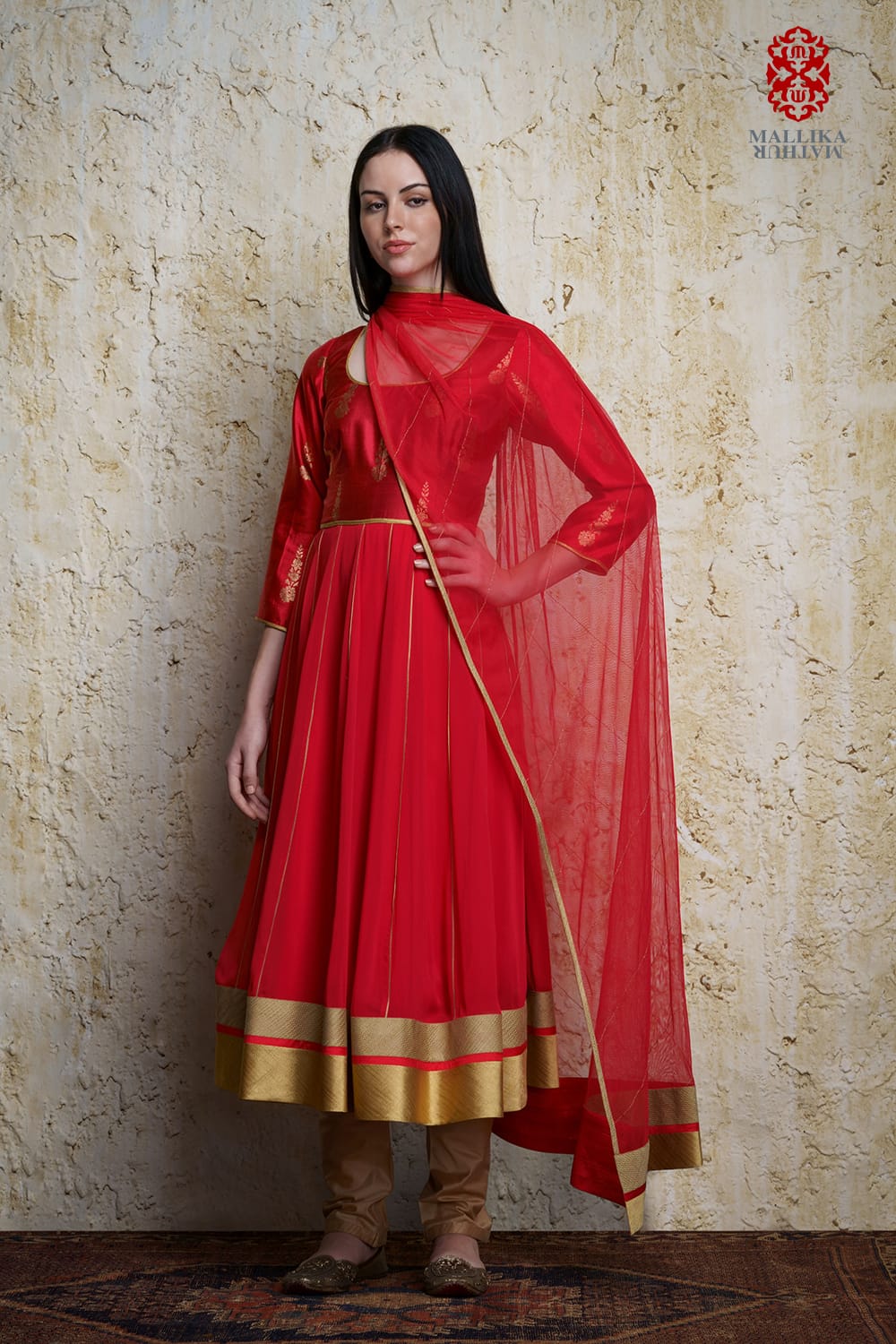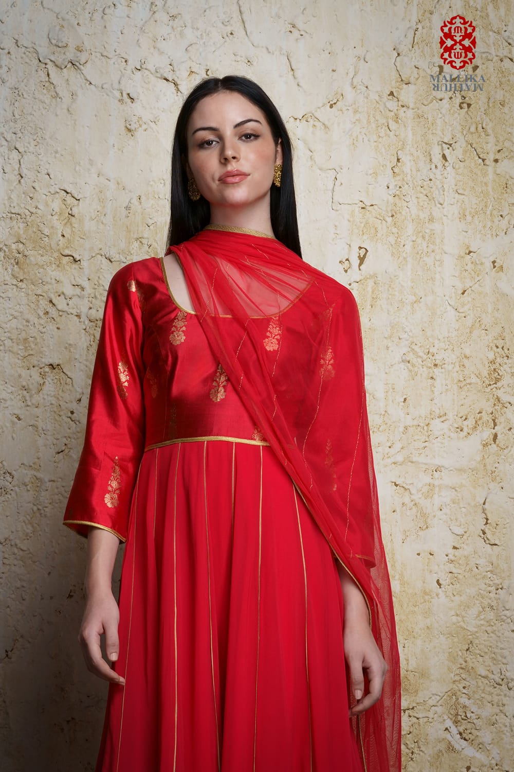 ‘Mehar’ vermillion red anarkali with a silk banarasi brocade bodice and georgette kalis adorned with zari borders. The Anarkali is a timeless and classic design of our collection that can be worn on any formal occasion.