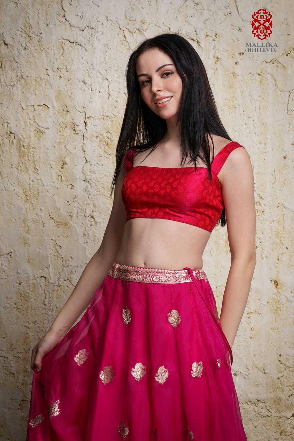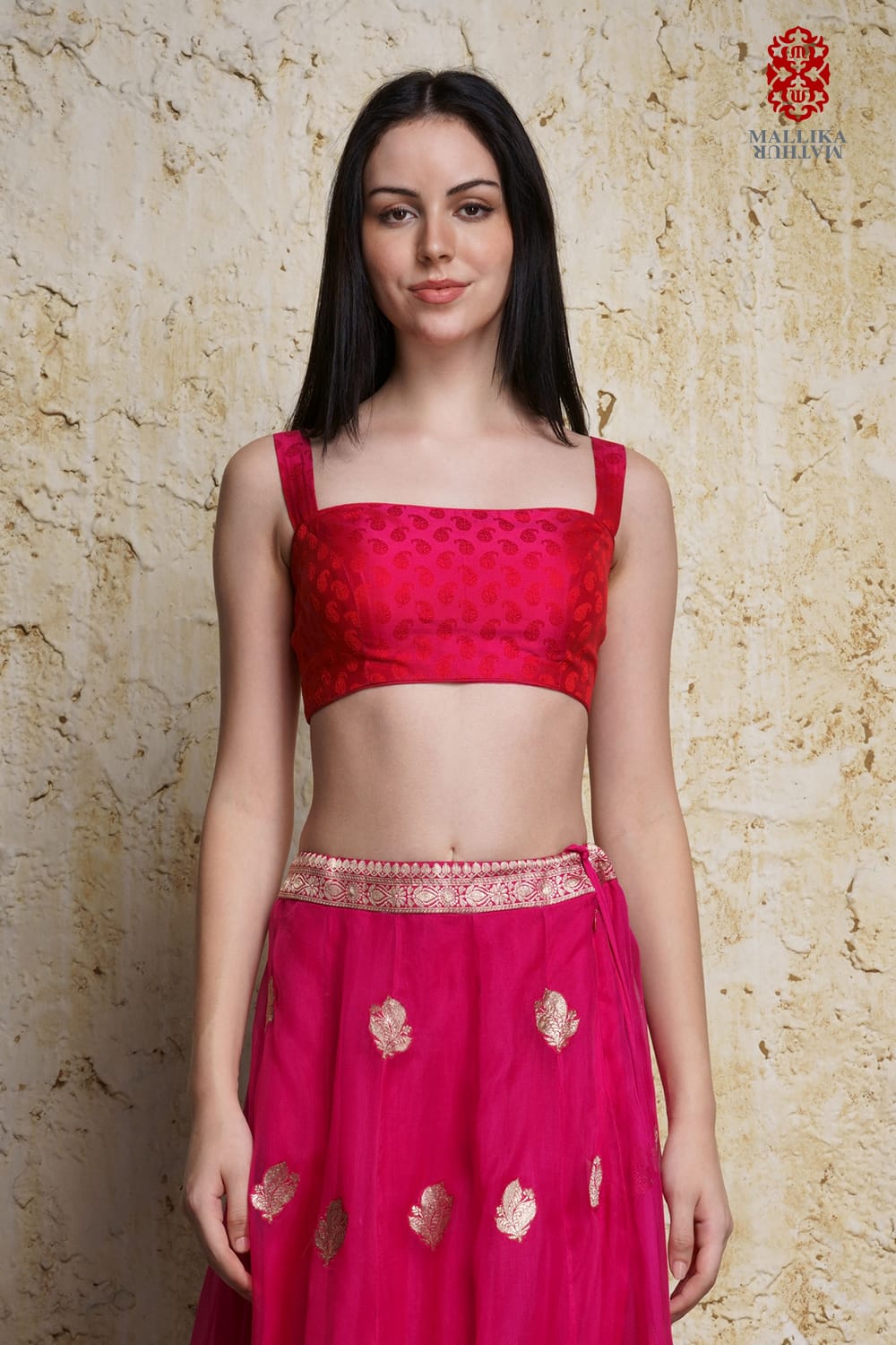 ‘Raisa’ sleeveless blouse with straps in cairi buti tanchoi silk blouse handwoven in red and pink resham thread. The blouse can be paired with a lehenga as shown or a sari.