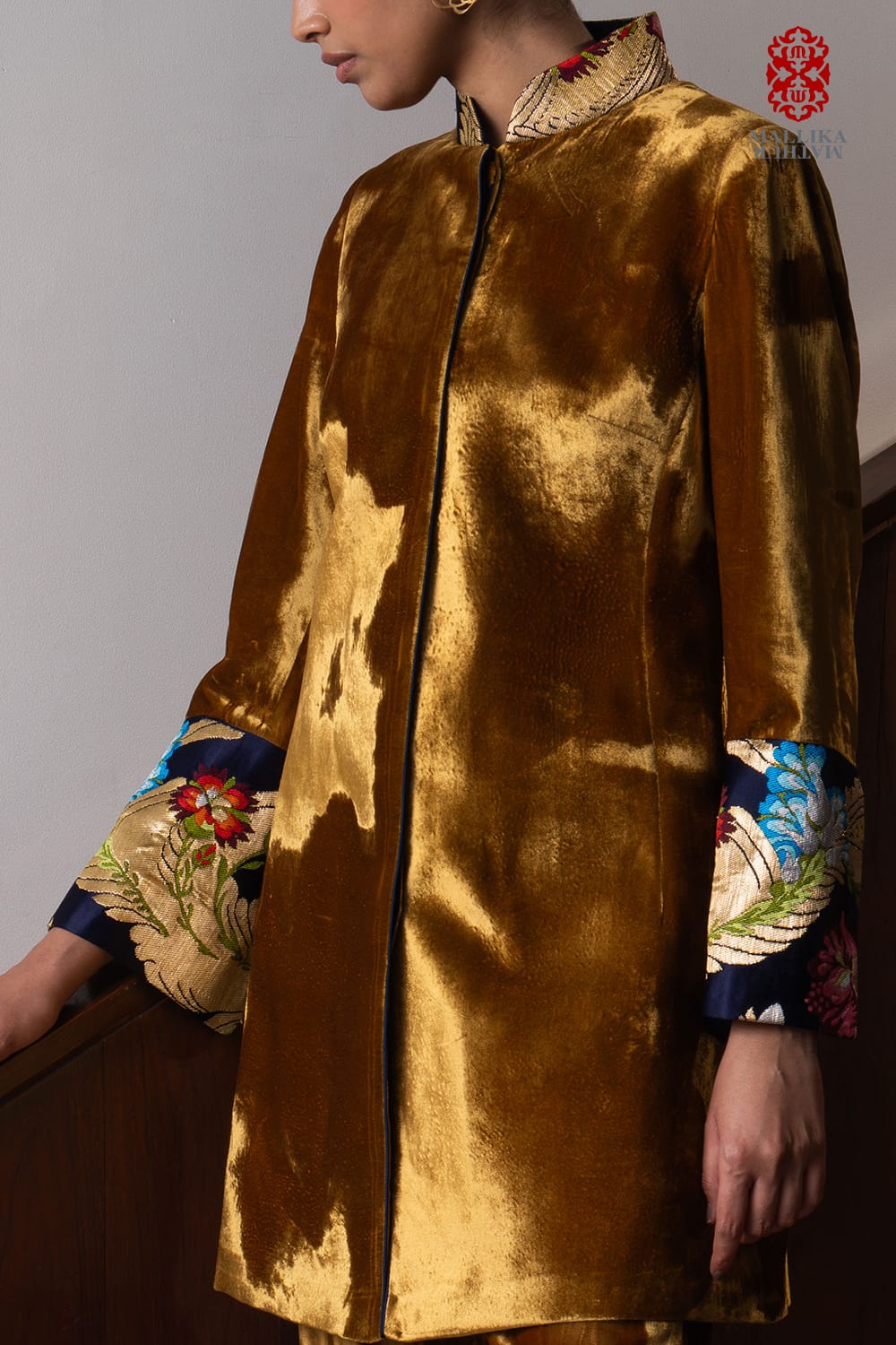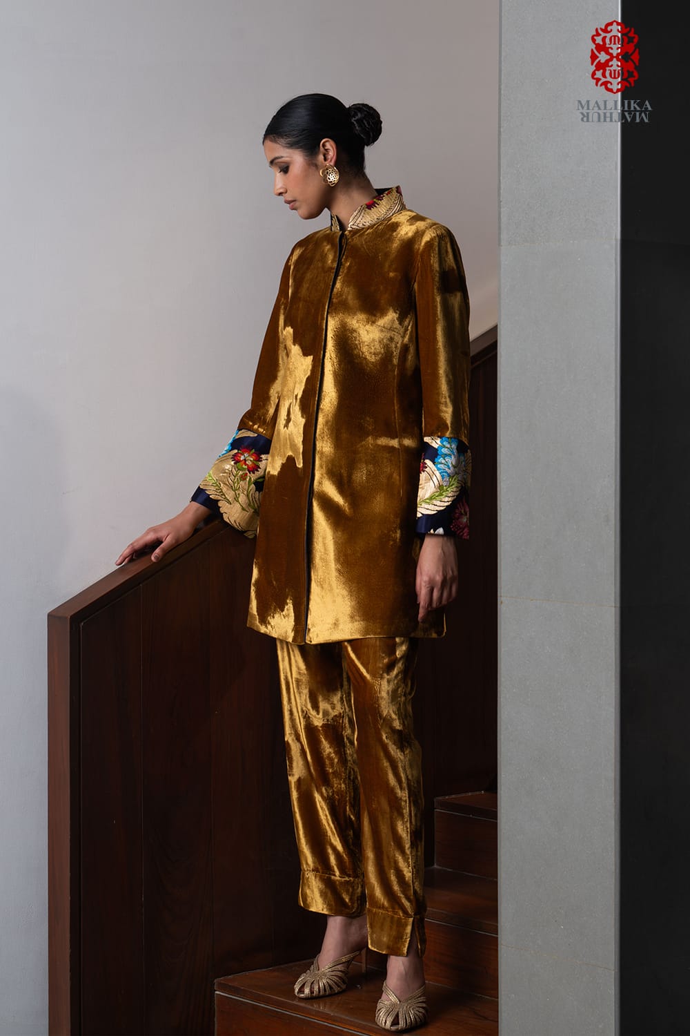 ‘Tashi’ yellow gold velvet jacket in a classic straight pattern decorated with crimson red floral design gyasar Tibetan brocade on the collar and cuffs. It is paired with black pants as shown here.